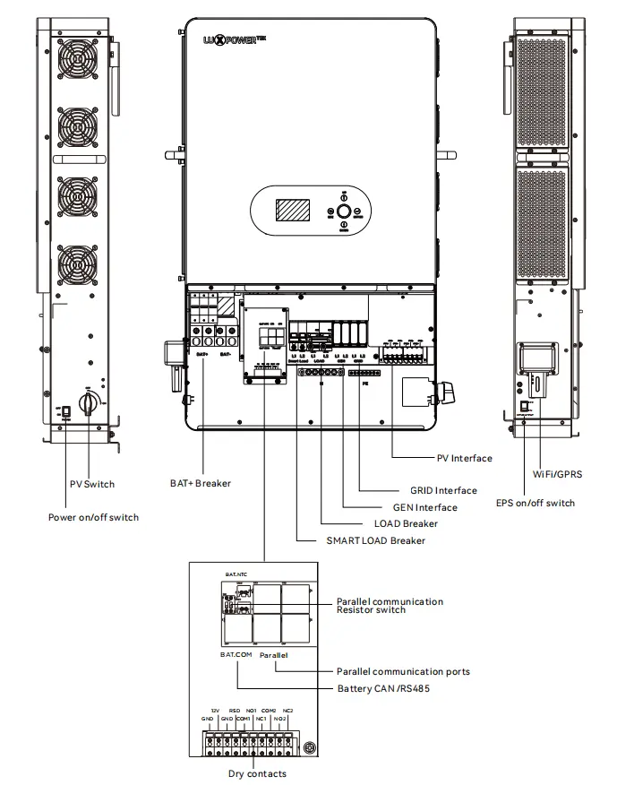 Projetado para resiliência, o LuxPower SNA-US 12000 possui portas de saída CA duplas para conectividade com várias cargas e uma capacidade de repasse contínua 100A robusta. Sua porta dedicada ao gerador e transição sem costura na grade/fora da rede garantem a fonte de alimentação ininterrupta em condições exigentes.